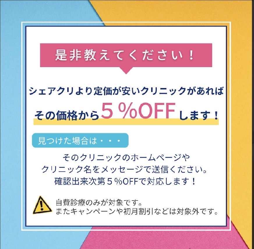シェアクリニックと提携いたしました。 2026年1月22日 いつもリリィファインをご愛顧いただき、誠にありがとうございます。この度、シェアクリニックと業務提携いたしました。 画像にて詳細をご案内いたします。 LiryFine専用紹介URLはこちら ↑スライドしてメニューをご確認ください。 LiryFine専用紹介URLはこちら